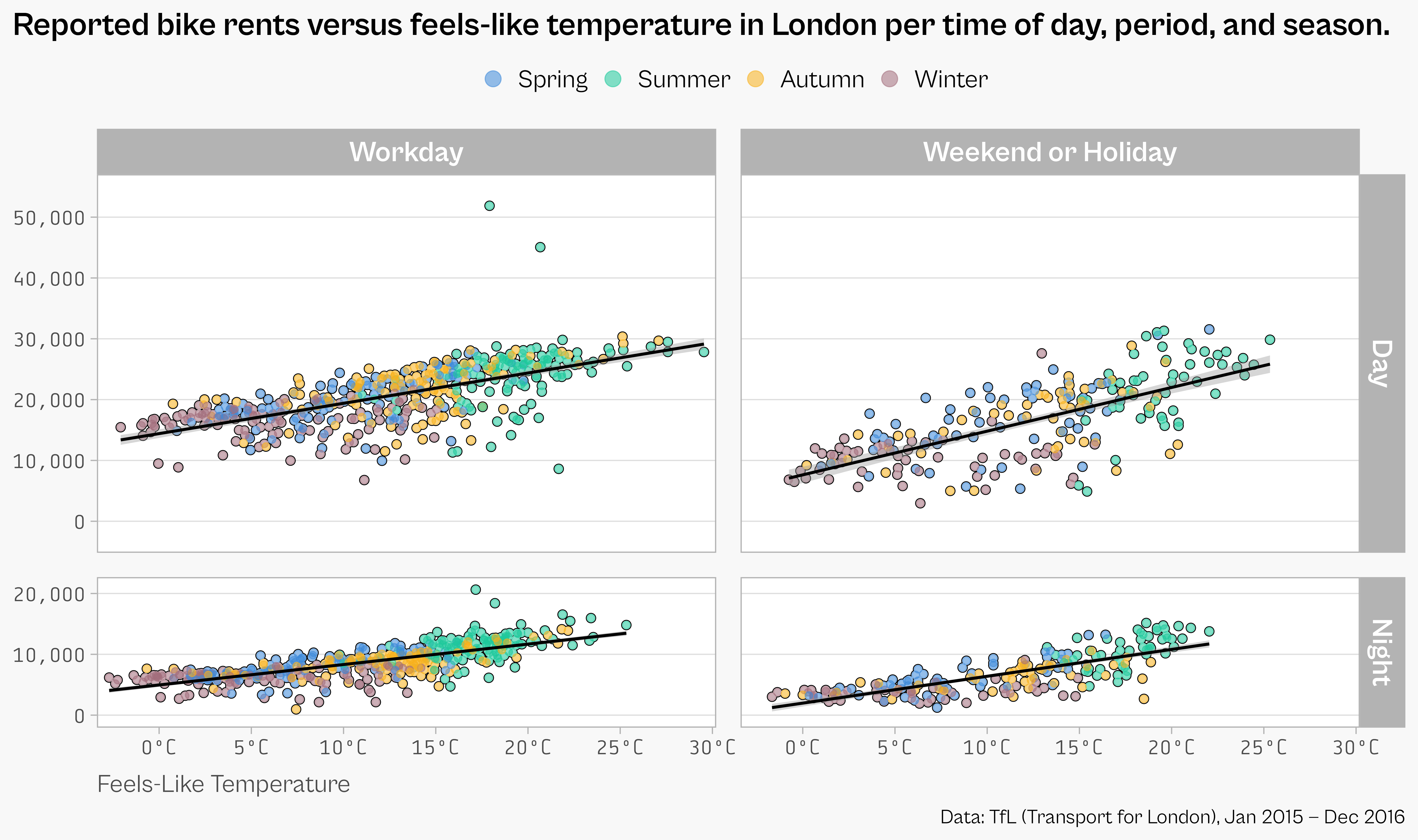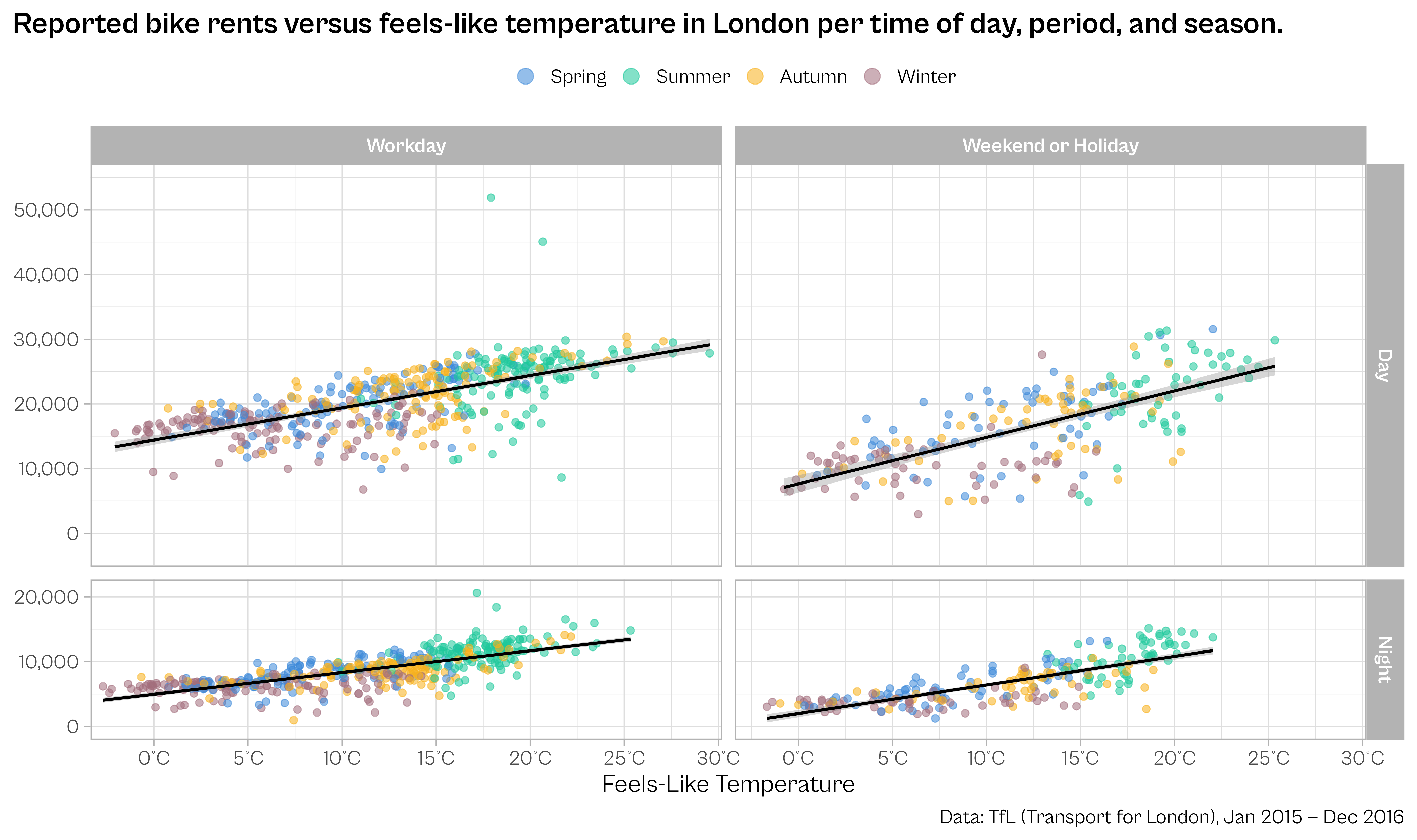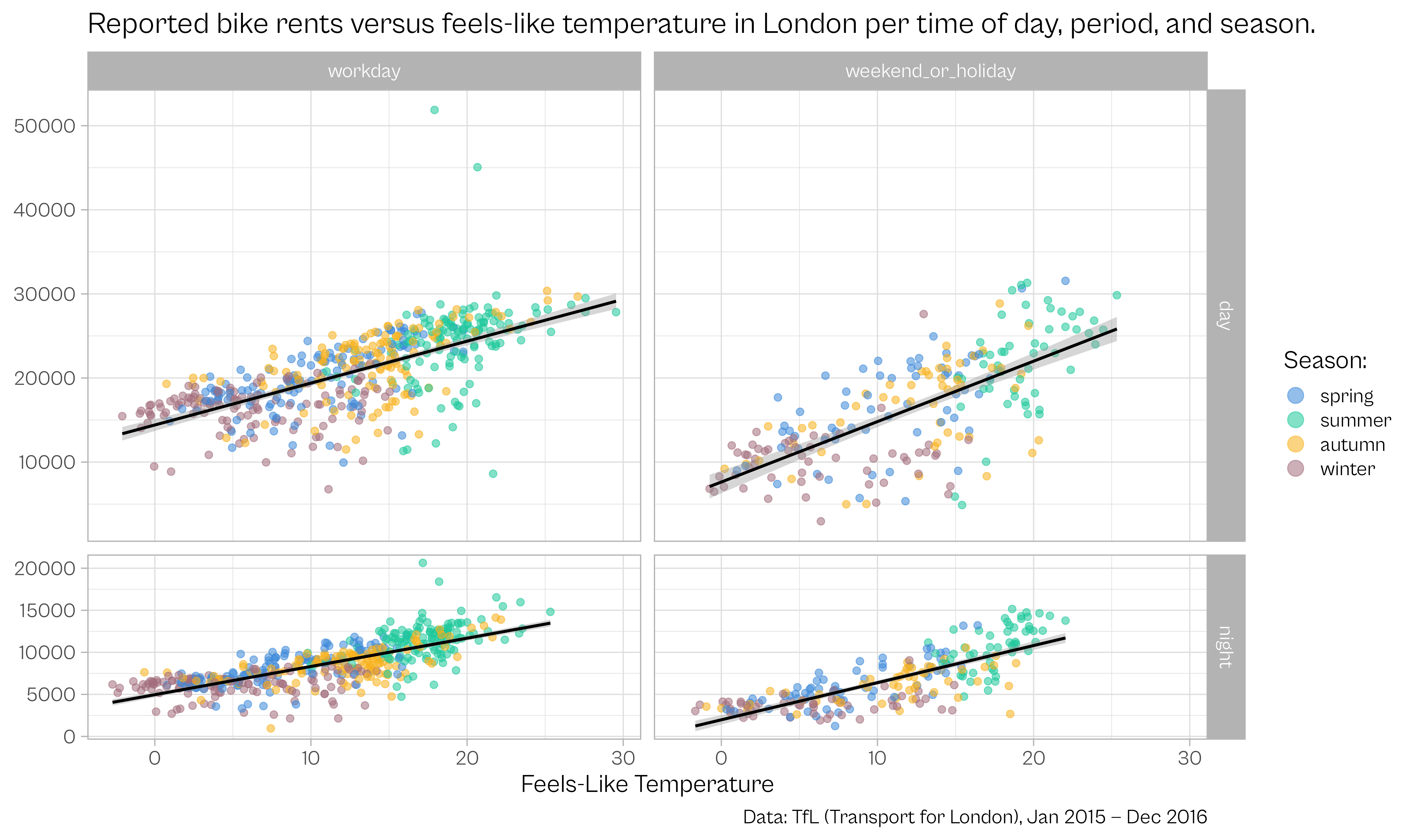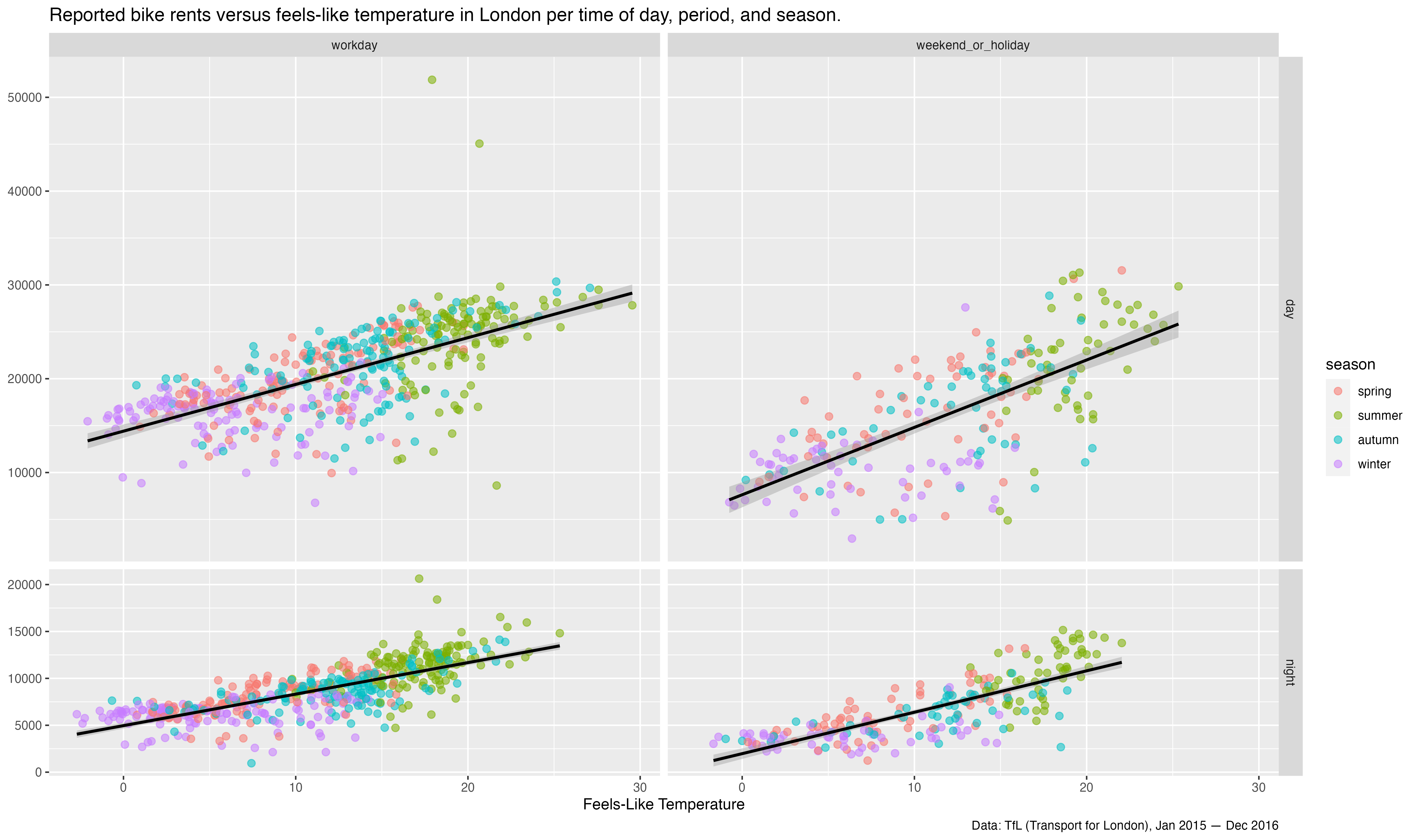 title = "Reported bike rents versus feels-like temperature in London per time of day, period, and season."