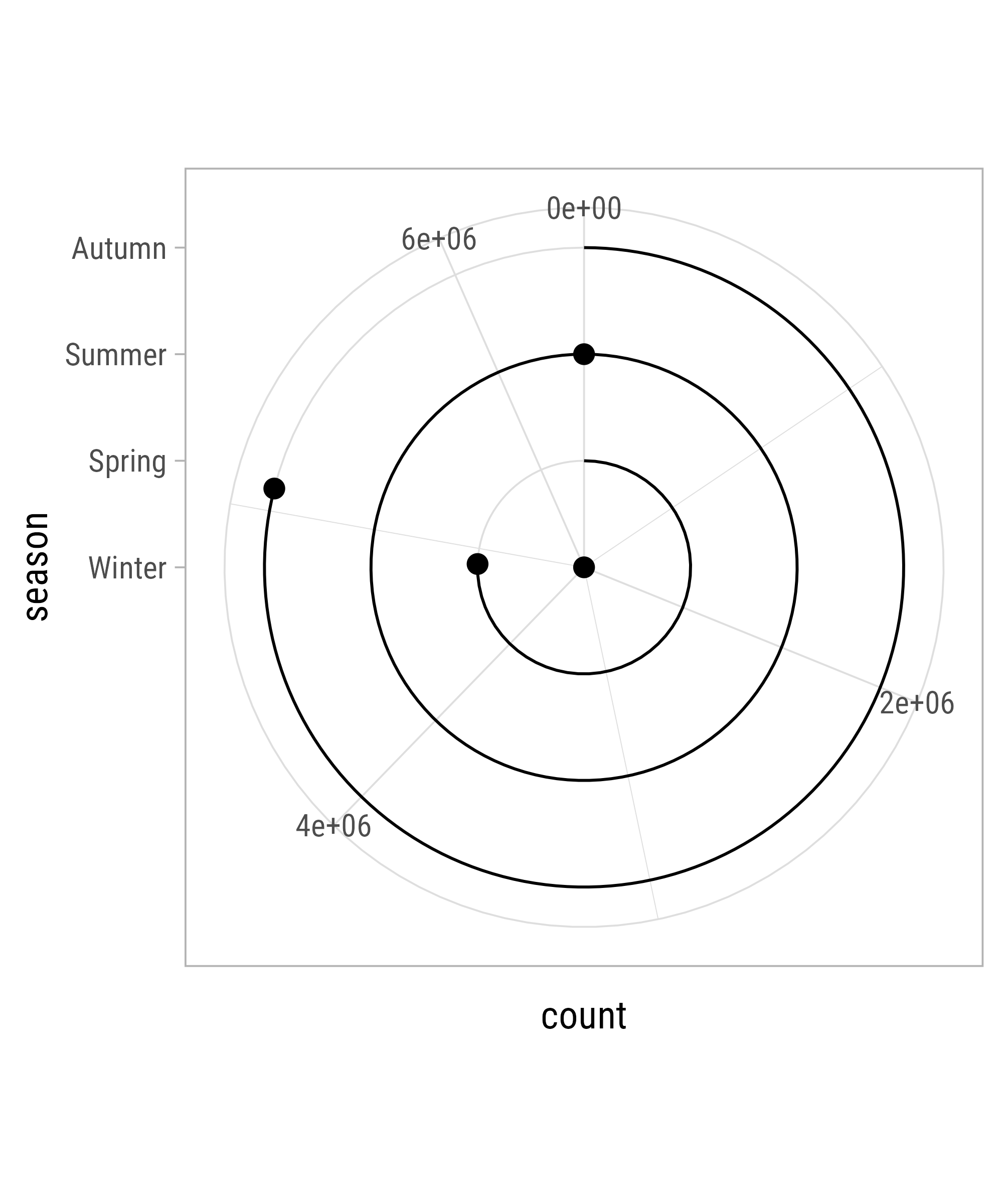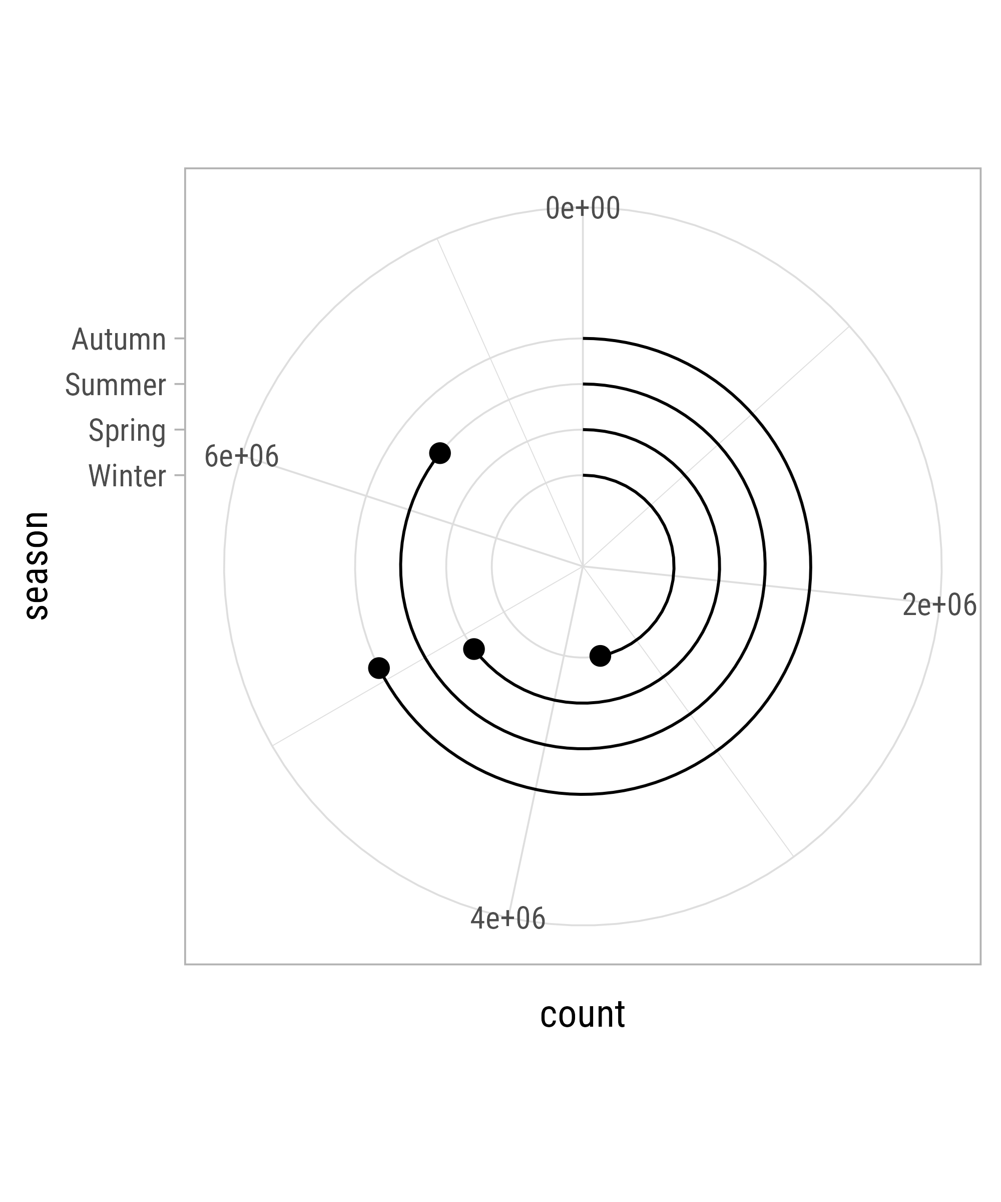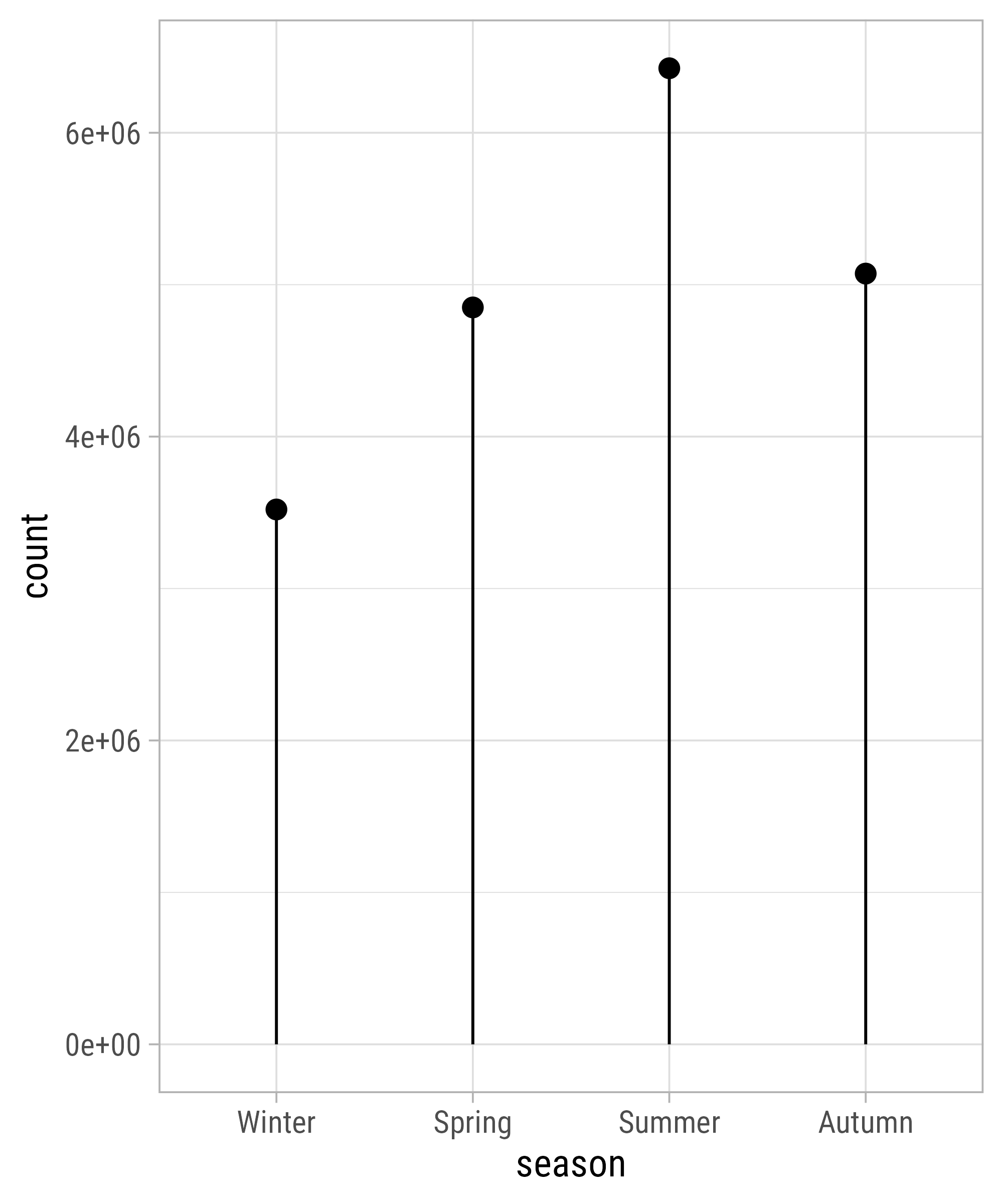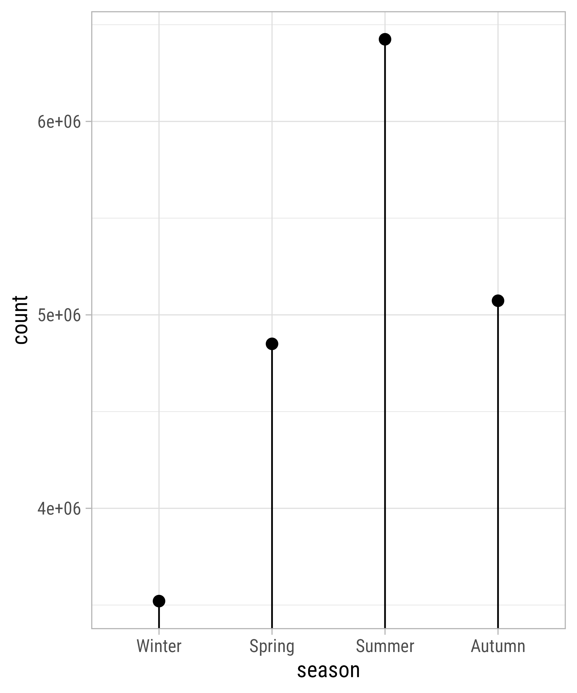stat_summary()ggplot(bikes, aes(x = as.numeric(season), y = count)) +