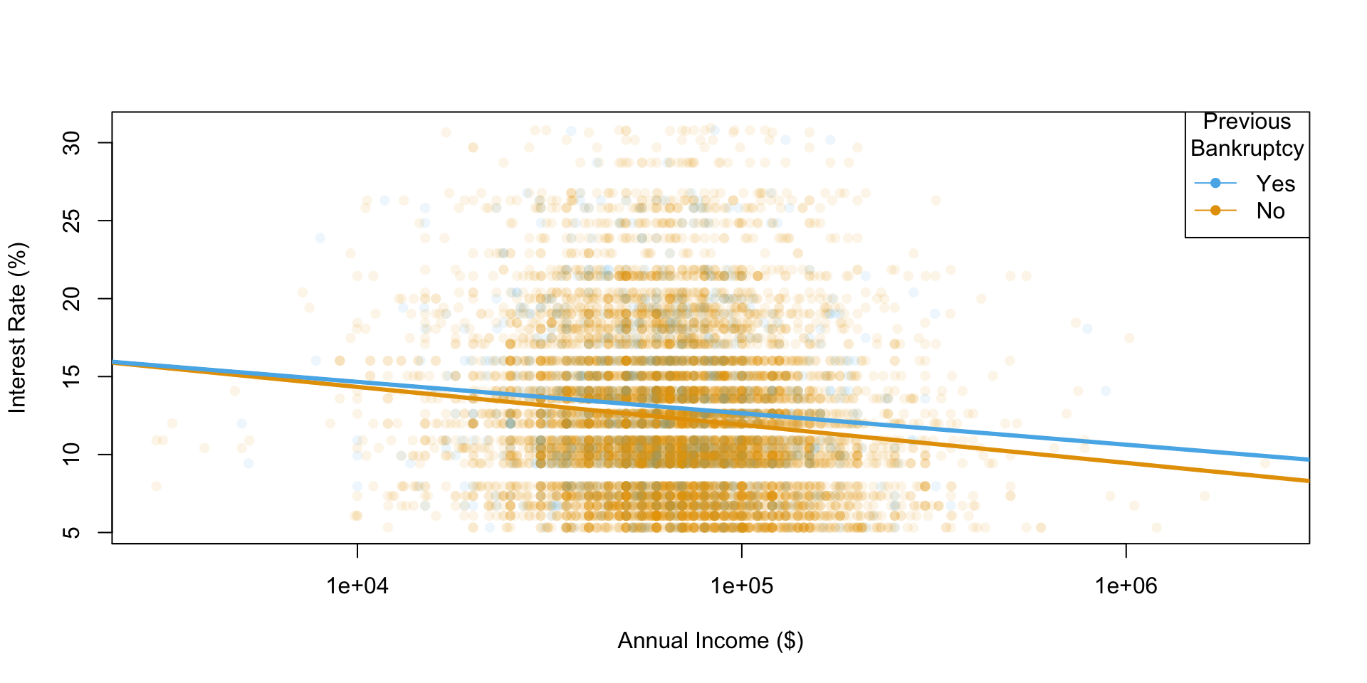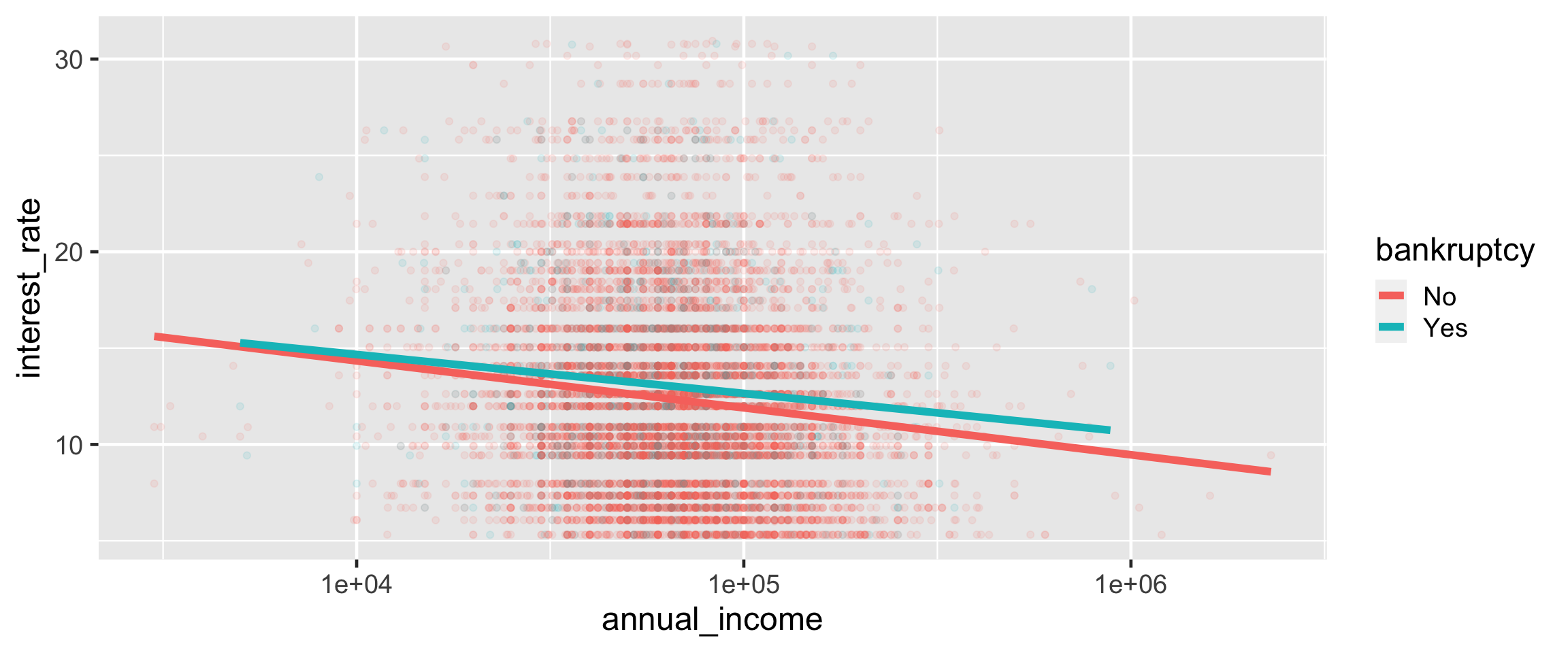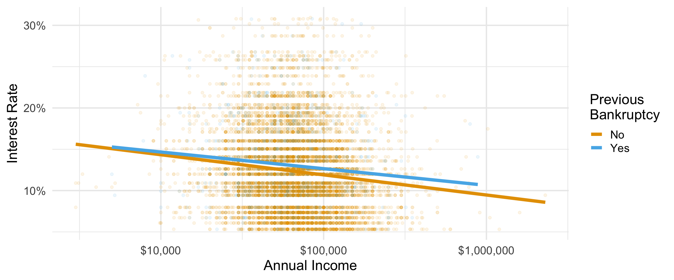 Visualize the relationship between interest rate and annual income, conditioned on whether the applicant had a bankruptcy.